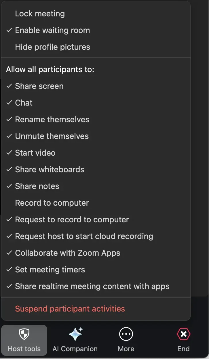 - Hosts must be familiar with Zoom's "Host tools", which are available during a meeting. Any user can start a meeting in their personal room to familiarize themselves with these tools. They include: